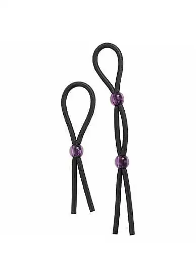 Slip one of these penis ties on and enjoy the ride of your life. Made of high-quality and hygienically-superior silicone, these rings are super stretchy and will adjust to accommodate most sizes. This two ring set features one tie for just the penis and another for the penis and testicles. The clear ball accents are used to adjust the sizes of these completely sturdy and flexible ties offering you long-lasting erections and helping to prolong ejaculation. Non-phthalate. Available in Purple and Black