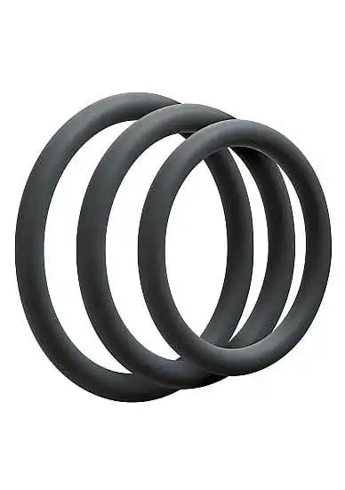 Optimize your experience with these silicone cock rings! The OptiMALE Thin C-Ring Set offers enhanced size and girth with three rings in 40mm 45mm and 50mm diameters. These rings are ultra-stretchable for easy use around the shaft or testicles maintaining those long-lasting erections youve always dreamed of and prolonging your ejaculation. Available in Black and Slate phthalate-free silicone.