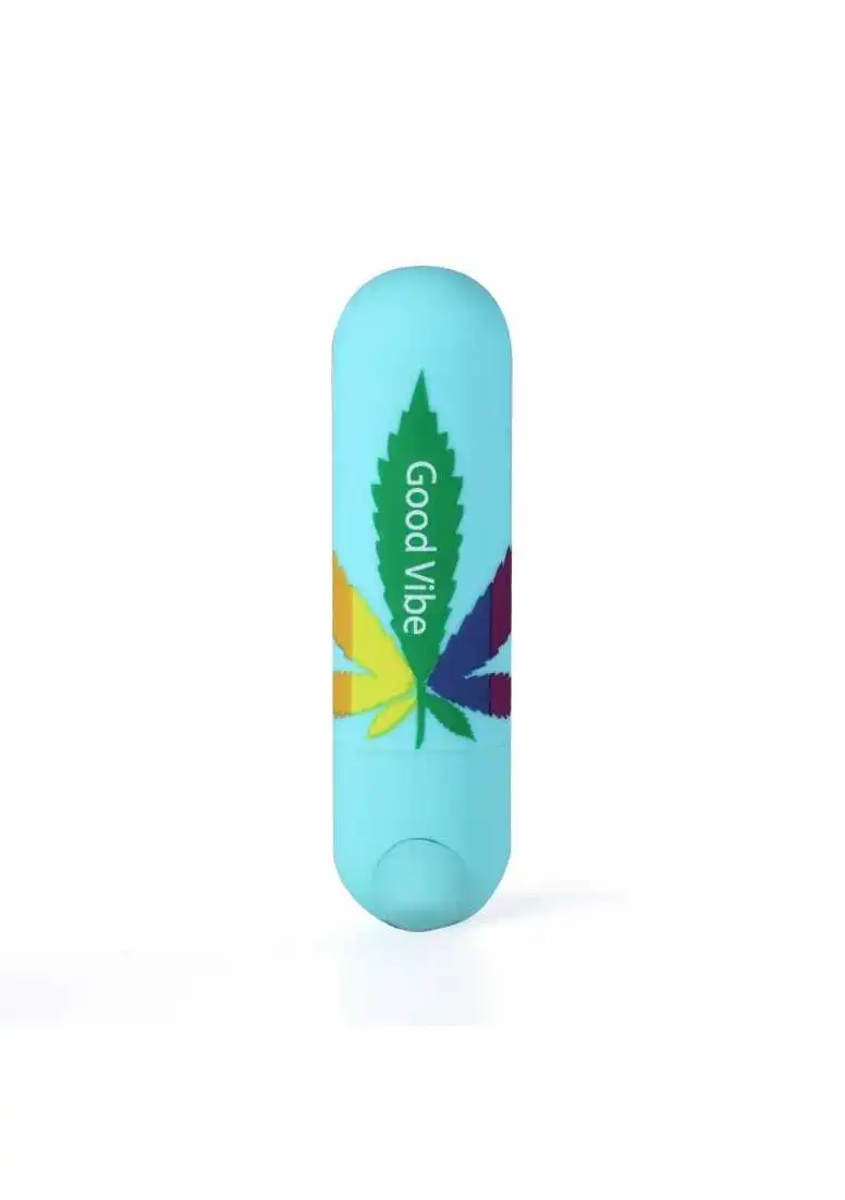 Jessi 420 10 Function Mini Rechargeable Bullet Vibrator Teal Blue with 420 pattern theme from Maia Toys. 10 function super charged mini bullet can be slipped into any purse or pocket easily. User your imagination to dream up more stimulating uses.