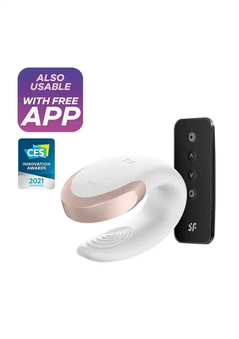 Double Love, onze luxe vibrator voor paren, is gemaakt uit opwindend zachte siliconen in combinatie met hoogwaardig edelmetaal. De dubbele combinatie van een handige draadloze afstandsbediening en onze high-tech app maakt spelen op lange afstand mogelijk met eindeloze opties! Geniet van een frisse wind bij het vrijen met de Satisfyer Double Love! De koppelvibrator met 2 motoren maakt indruk met zijn klassieke U-vorm, die beide partners stimuleert met krachtige trillingen. De licht gebogen schacht wordt vaginaal ingebracht en stimuleert tegelijkertijd de G-spot en de penis, terwijl het bovenste deel de clitoris extra verwent. De lichaamsvriendelijke siliconen zorgen ook voor een gladde uitstraling.De Satisfyer Double Love heeft ook optisch veel te bieden: De edele details gemaakt van hoogwaardig, echt metaal geven je liefdesleven een vleugje luxe. De Satisfyer Double Love kan worden bediend met de bijgeleverde draadloze afstandsbediening of met de gratis Satisfyer Connect app. Met de app kun je samen nieuwe facetten van je liefdesleven ontdekken: Naast de besturing van je wellness accessoire op afstand kun je ook je eigen trilprogramma’s maken of audio- en videochats starten. Waar wacht je nog op? Omdat de koppelvibrator waterdicht is (IPX7), verrijkt hij ook het vrijen onder de douche of in bad met hete trillingen. Als de koppelvibrator zijn kracht verliest, kunnen de ge?ntegreerde batterijen worden opgeladen met de bijgeleverde USB-oplaadkabel.