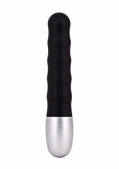 Silky smooth vibrator with ribbed and tapered design. Easy to travel with. Twist the aluminum base to turn the vibrator on/off. Unscrew the bottom to place one AA battery.