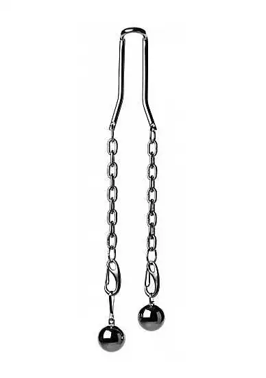 Test your limits with a unique ball stretcher and two 8 ounce weights! Start with a manageable tug by slipping the U portion of the stretcher onto your scrotum above your balls. Savor the pull of the heavy-duty stainless steel as gravity takes it toll! Two connector chains dangle with convenient hooks for adding each of the weighted balls… or maybe even more! How much can you handle? Play on your own or with your Master or Mistress! The durable material is non-porous making it easy to sanitize after each use